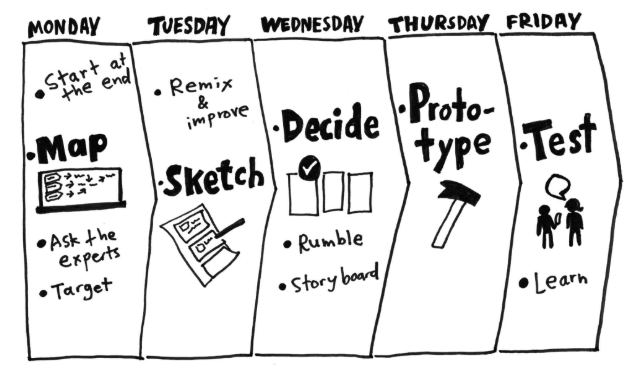 Each day of the sprint incorporates a group of activities around a specific goal and milestone.